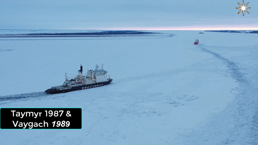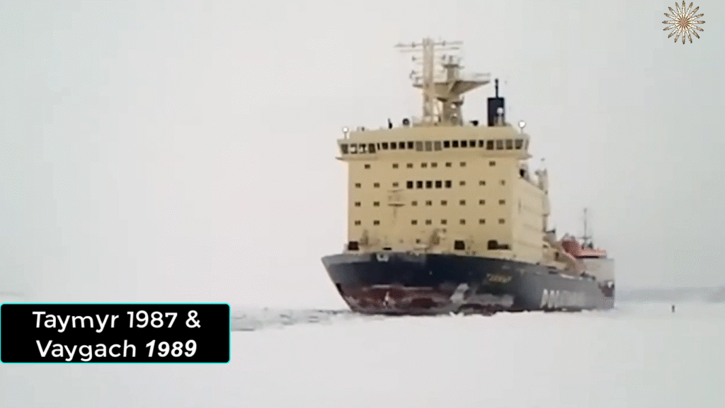 Conceived during the final years of the Soviet Union, Taymyr (commissioned in 1987) and Vaygach (1989) were designed for a problem few ships could solve. The great Siberian rivers—the Yenisei above all—are lifelines stretching thousands of kilometers inland, but where they meet the Arctic Ocean, nature conspires against navigation. Ice pressure, shallow waters, shifting sandbanks, and extreme cold form a barrier that traditional icebreakers, with their deep drafts, cannot easily cross. The solution was radical in its restraint: compact nuclear icebreakers with shallow drafts, powerful enough to break ice, yet agile enough to operate where sea and river blur into one.